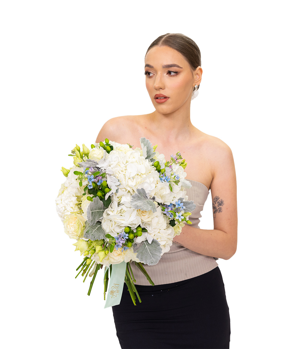 9 trandafiri albi, 6 hortensii albe, 7 eustoma albă, 9 senecio, 9 oxypetalum, 7 hypericum verde