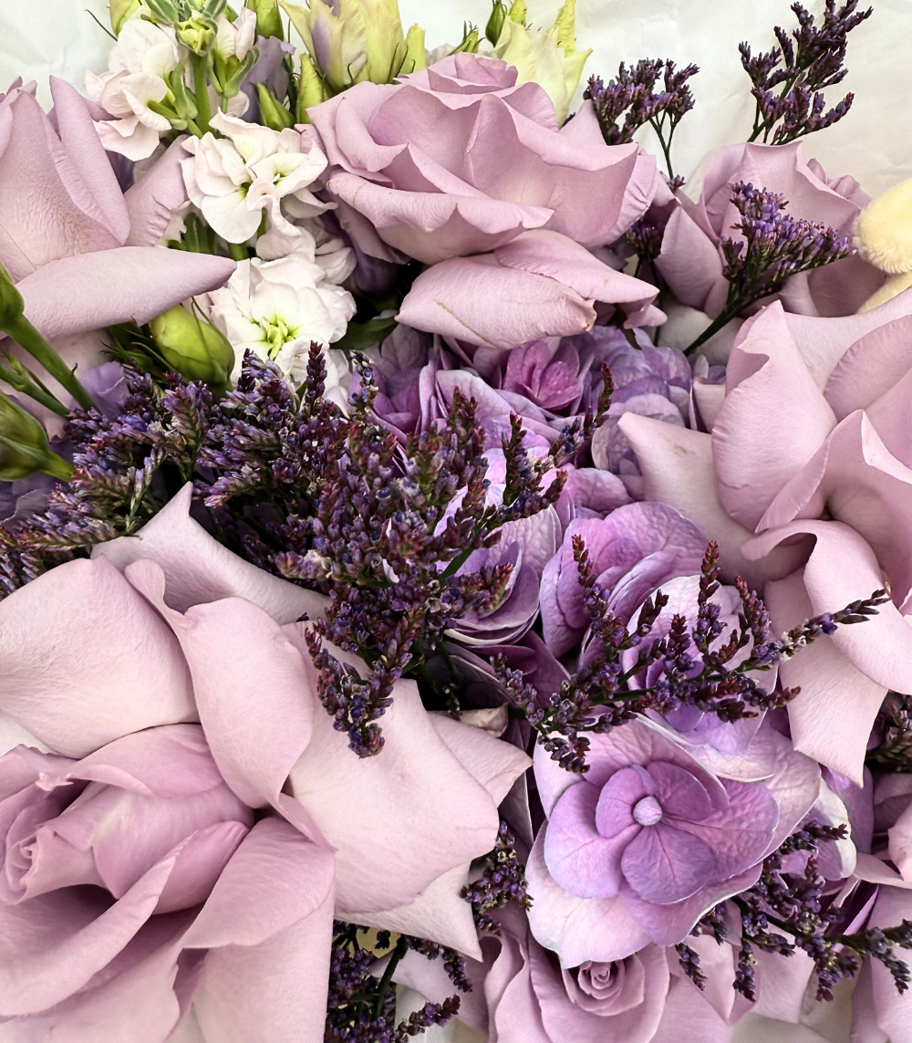 • 2 fire de limonium mov, ușor aerate și cu textură delicată, adaugă profunzime buchetului. Limoniumul este floarea amintirilor durabile, un simbol subtil al legăturilor care rămân nealterate în timp.