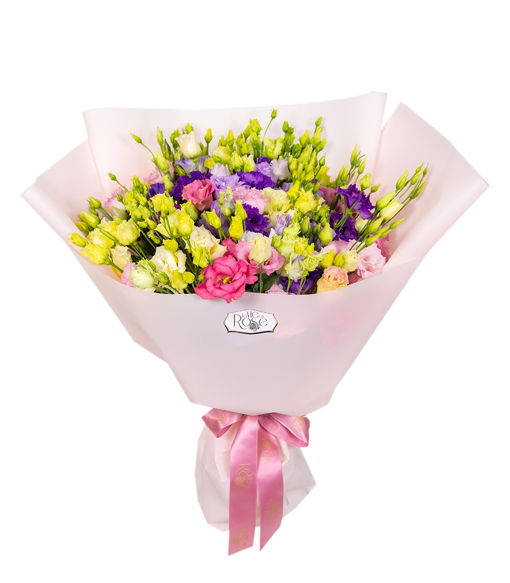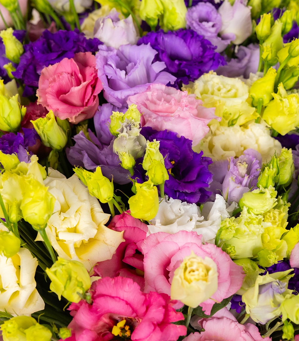 Un buchet cu eustoma colorate conține flori lisianthus, o plantă ale cărei flori sunt foarte apreciate de persoanele cu gusturi deosebite și care au o pasiune pentru utilizările decorative ale florilor. Ea produce flori deosebite, nuanțe de la alb la galben, de la albastru la violet și de la roz la roșu. În general, înflorește din mai până în luna octombrie în mod natural și provine din sudul SUA, Caraibe, Mexic și nordul Americii de Sud.