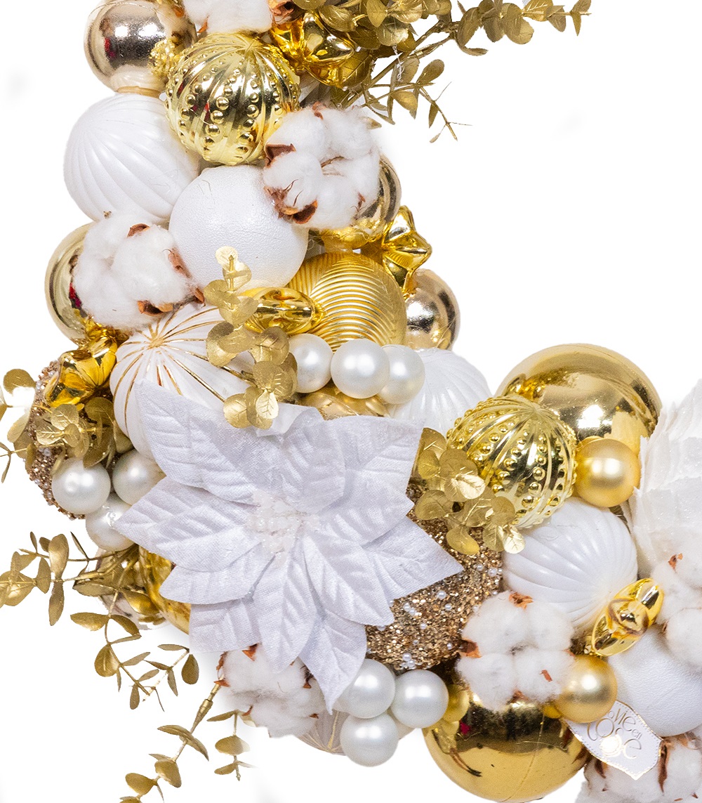 Accesorii de iarnă în alb și auriu: Coroniță de Ușă pentru Crăciun – Champagne Christmas este împodobită cu accesorii de iarnă în nuanțe de alb și auriu, care adaugă un plus de strălucire și festivitate. De la fulgi de zăpadă strălucitori la mici elemente aurii, fiecare detaliu este ales cu grijă pentru a completa frumusețea coroniței.