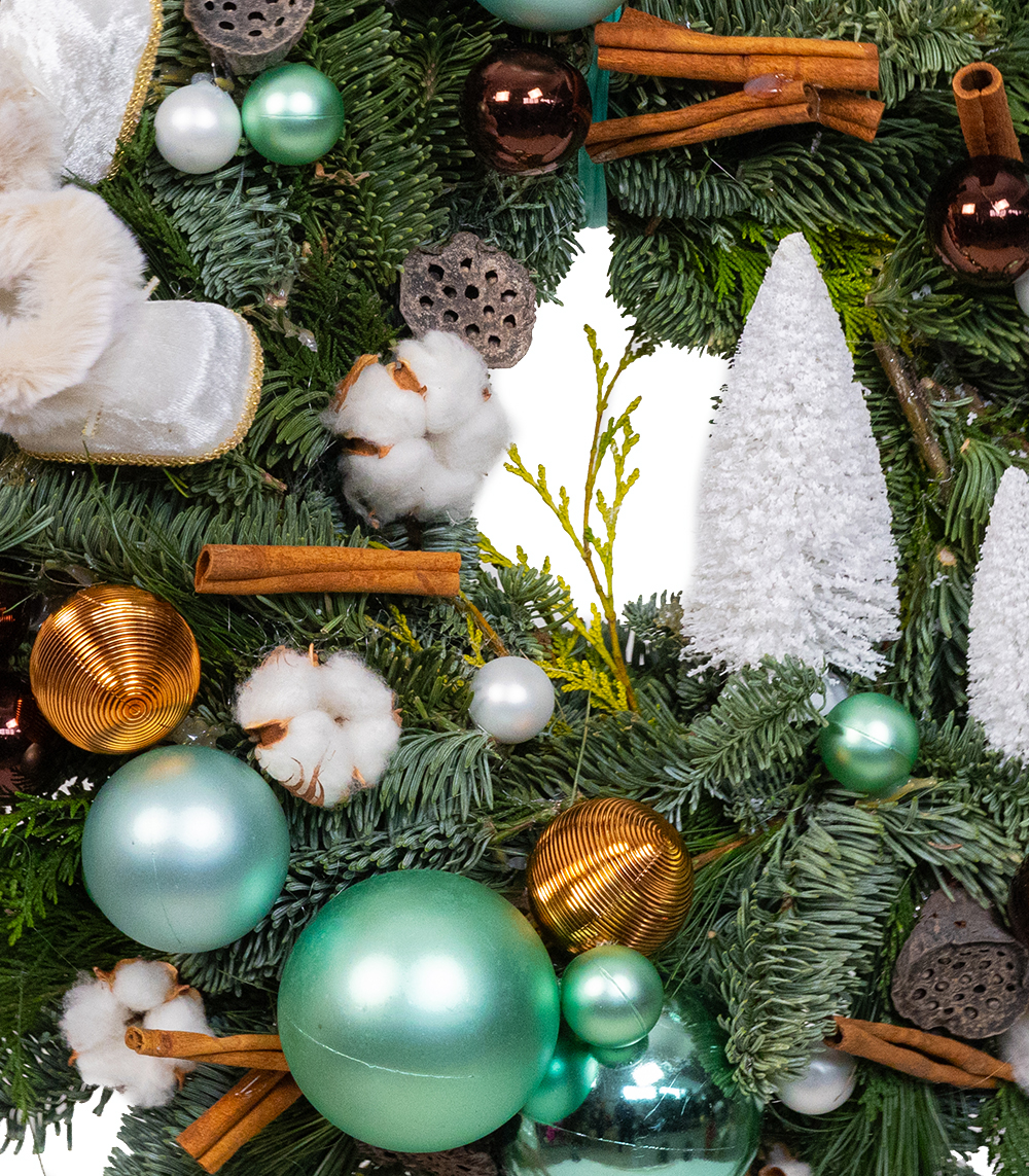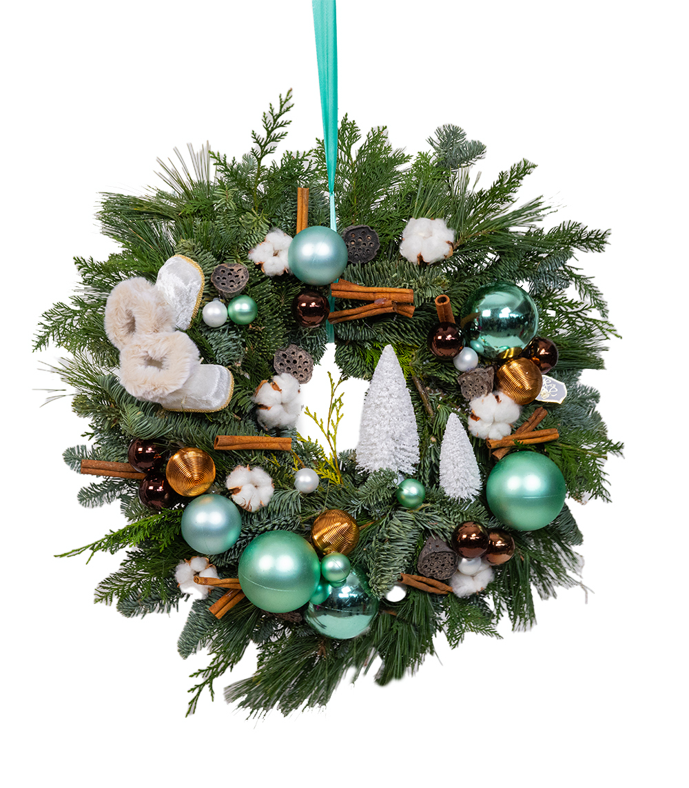 Coronița din brad și pin – Mint Blue este o coroniță împletită din ramuri de brad și pin, naturale, decorată cu accesorii de iarna, în culori de alb, albastru, mint, turcoaz și maro.