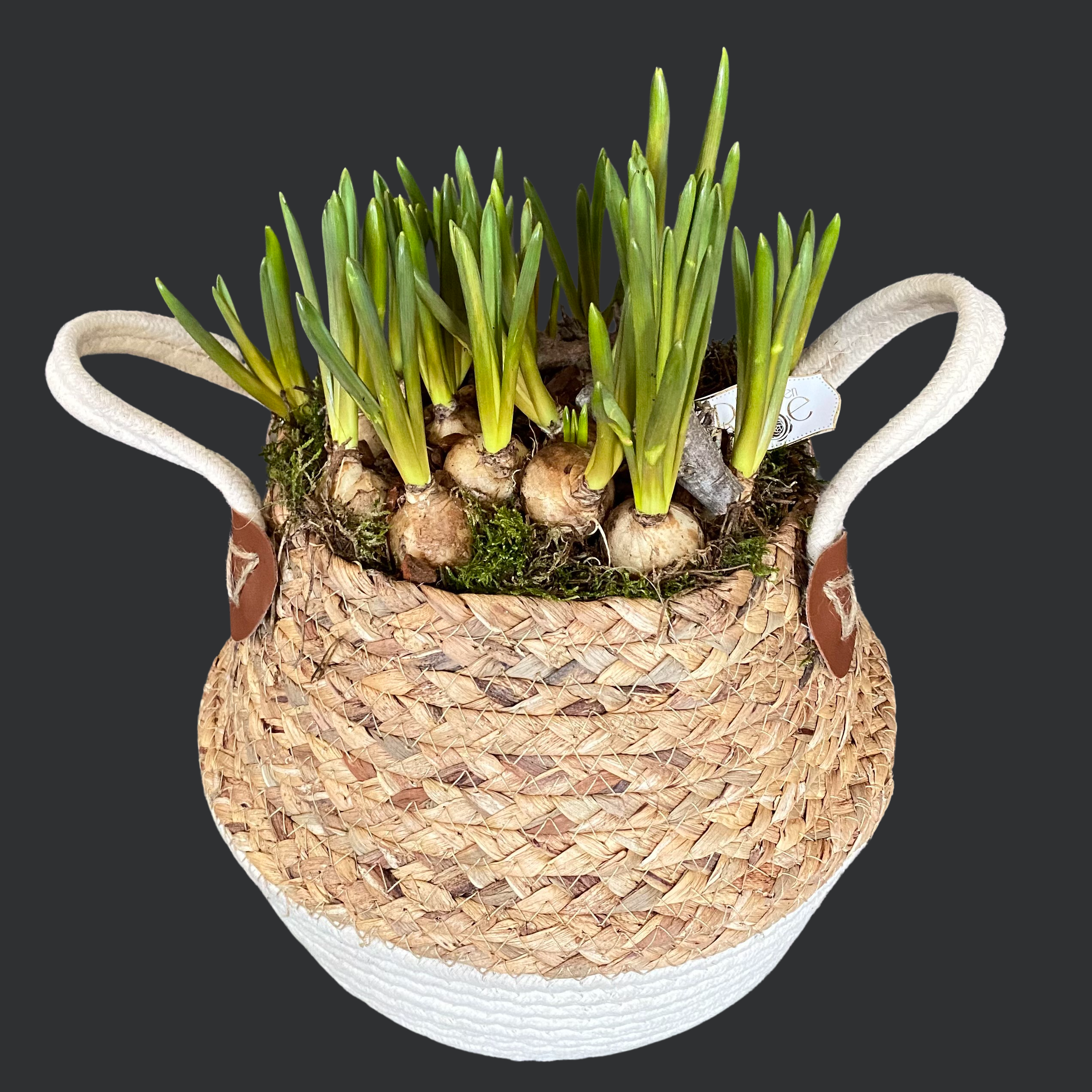 Totul este compus din elemente naturale, începând cu coșul din iută, regăsit în nuanțe de alb și bej, cu dimensiuni de 20 cm diametru și 25 cm înălțime. Bulbii sunt plantați în pământ și necesită o îngrijire minimă. Noi recomandăm să te ocupi de udarea acestui aranjament o dată pe săptămână, să-l plasezi într-un loc luminos, dar ferit de razele directe ale soarelui.