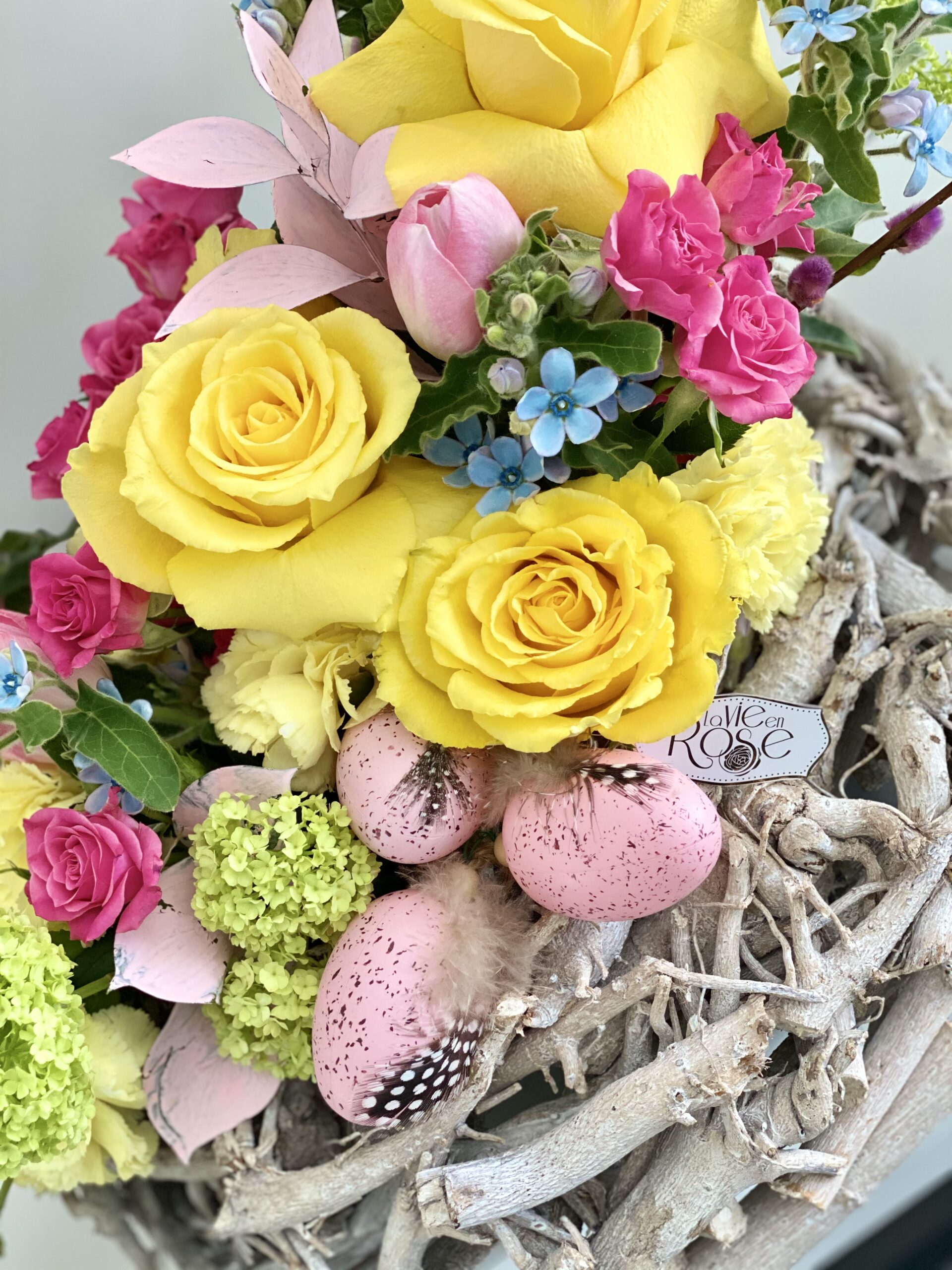 De asemenea, florile pe care le-am ales pentru acest aranjament nu sunt deloc întâmplătoare, așa cum nu este nici combinația lor cromatică. Am avut în vedere în acest cuib de ouă cu flori naturale să aducem în prim plan culorile pastelate pe care ni le oferă primăvara și să ne bucurăm împreună de vivacitatea acestui sezon al învierii.