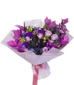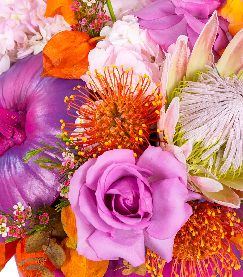 În contrast cu peisajul arămiu regăsit acum în natură, îți propunem un aranjament floral care vibrează într-o paletă de nuanțe purpurii, încadrat în contextul toamnei printr-un dovleac violet, scos din contextul comun.