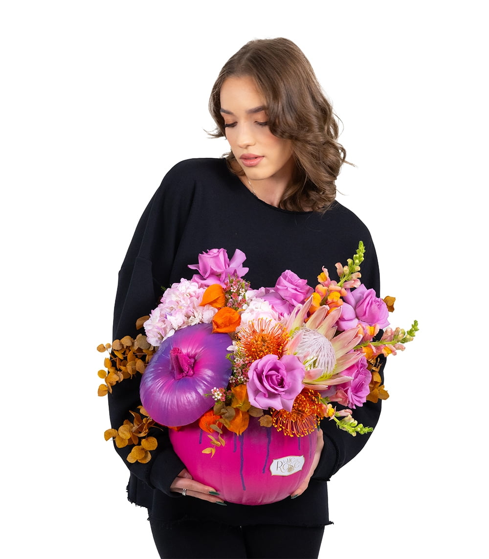 Întocmai pentru că toamna este un sezon atât de volatil (poate cel mai?) ne-am gândit să creăm un aranjament de flori pe care tu să îl poți personaliza, desigur în limita stocului de care dispunem, în așa fel încât să se potrivească mănușă (că tot vine frigul) persoanelor dragi. Știm că nu există cadoul perfect în general, dar un arajament de flori în dovleac poate fi cadoul perfect pentru persoana pe care o ai în minte și care iubește toamna atât de mult.
