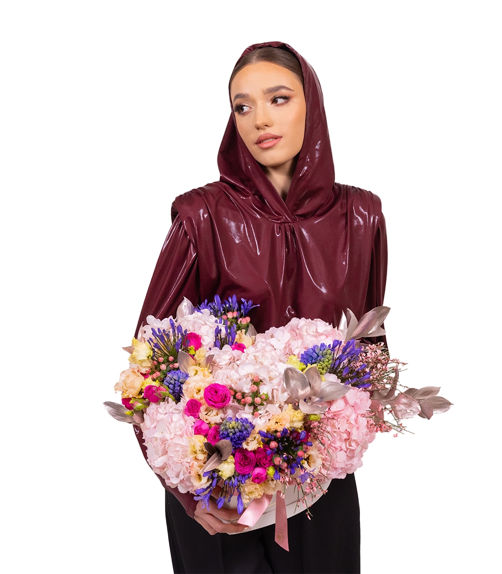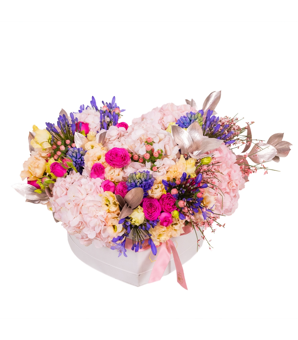 Iti oferim o uriasa cutie in forma de inima cu un mix de flori colorate, in toate nuantele iubirii. Florile sunt selectate cu atentie de catre floristii nostri si aranjate intr-o forma speciala, de inima.